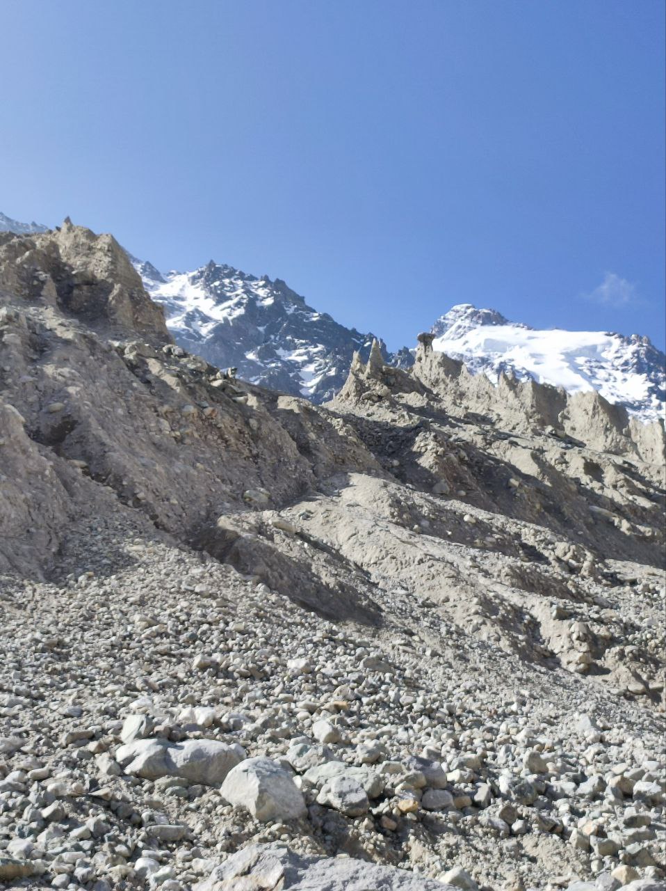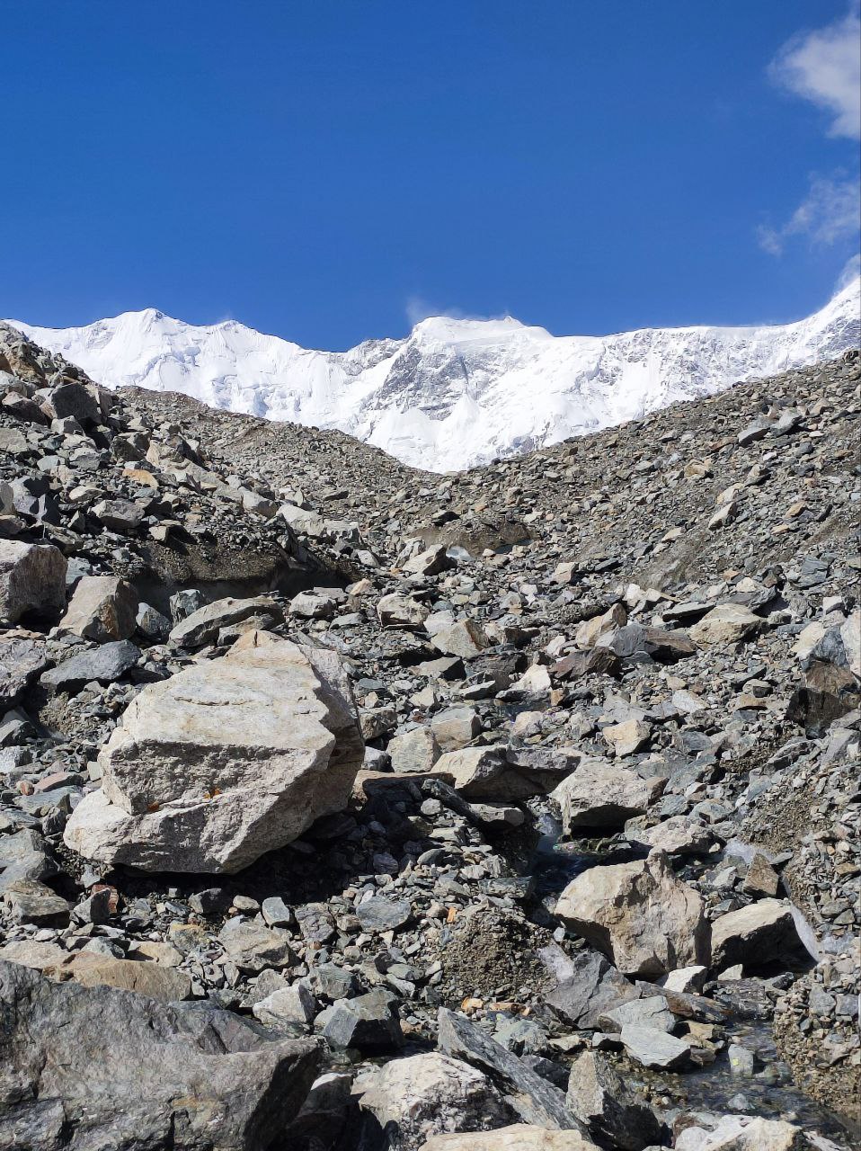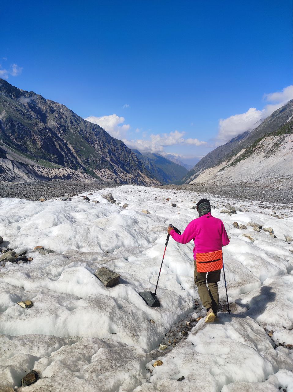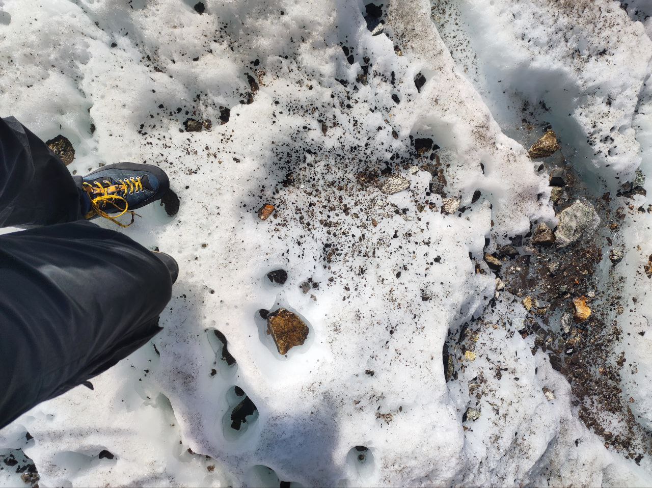Дальнейший путь лежит по камням, покрывающим лёд. Кошки не нужны, но обувь с высокой голенью обязательна: острые камни часто сбивают стопы. На леднике нет тени, необходимо пользоваться солнцезащитным кремом и очками. Воду можно брать из талых проталин.