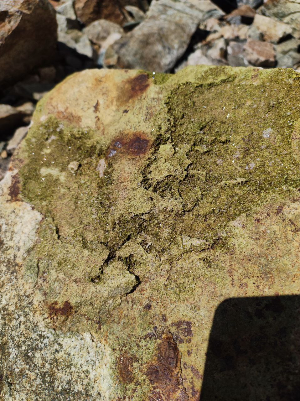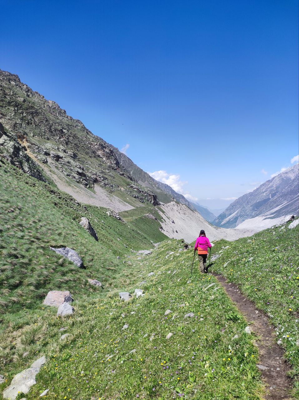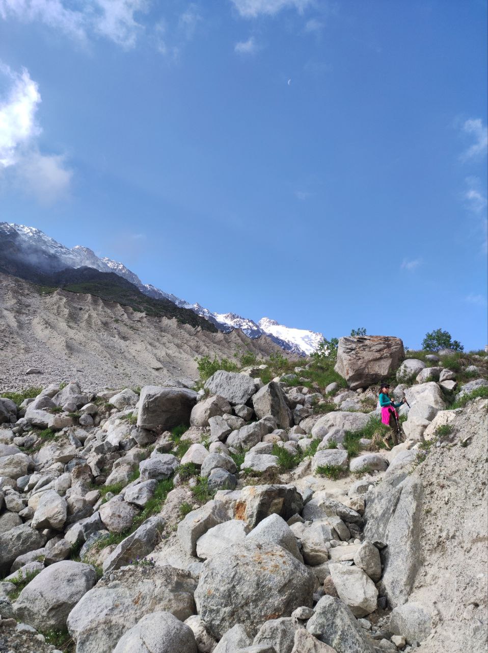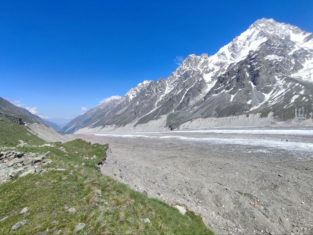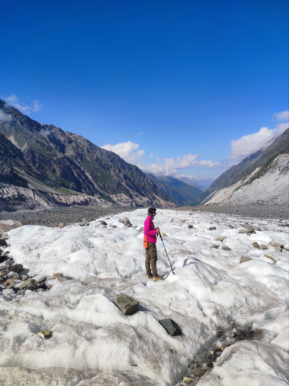 Дальнейший путь лежит по камням, покрывающим лёд. Кошки не нужны, но обувь с высокой голенью обязательна: острые камни часто сбивают стопы. На леднике нет тени, необходимо пользоваться солнцезащитным кремом и очками. Воду можно брать из талых проталин.