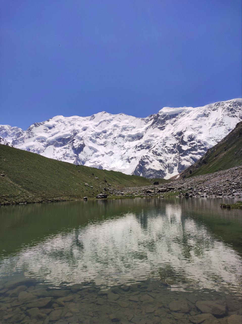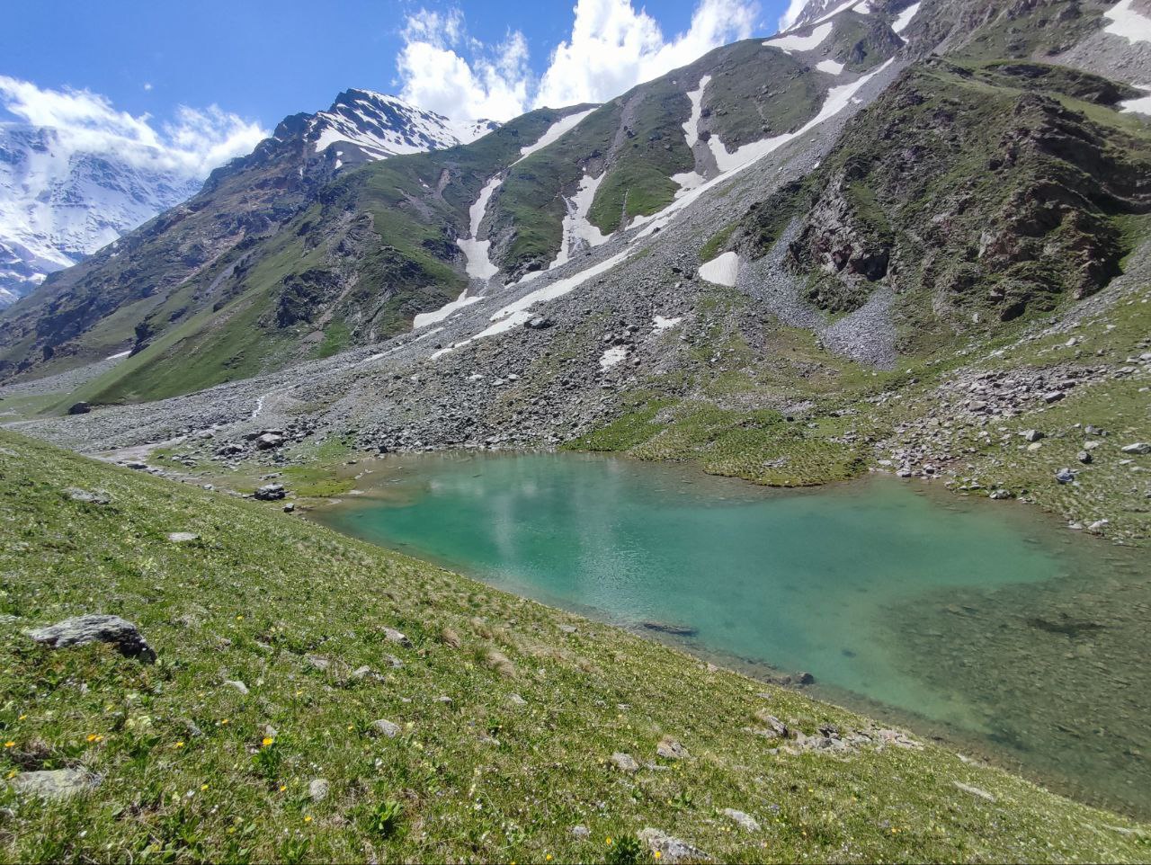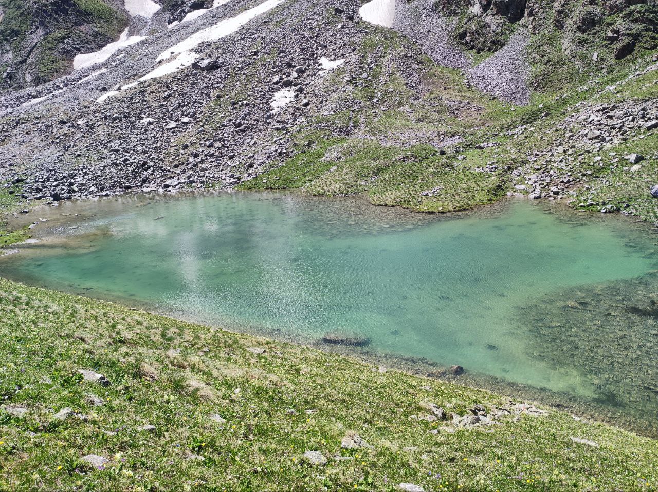 Озеро Баран-кёль расположено в тихом и тёплом месте, защищённом от ветра, что контрастирует с ледяным пространством ледника. Здесь особенно чувствуется покой и уединённость.